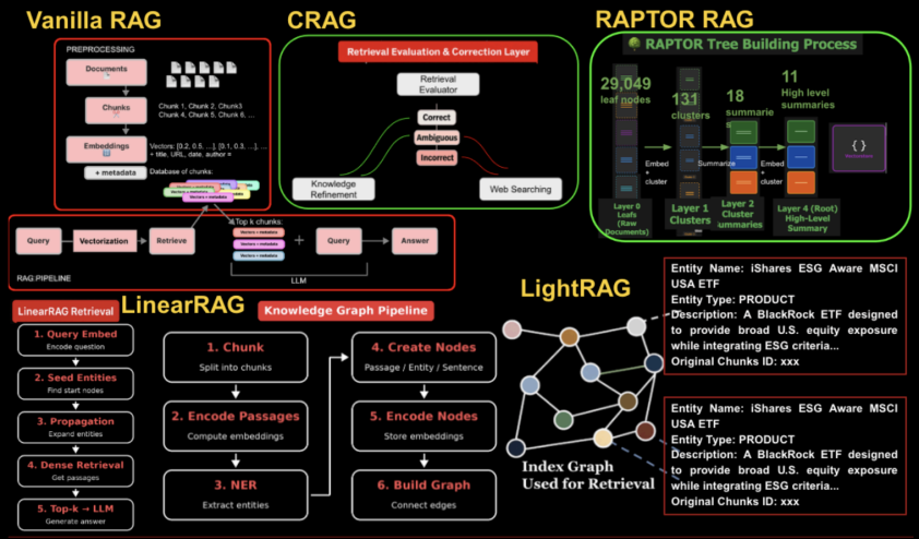 We evaluate multiple RAG architectures including vector search, hierarchical retrieval,