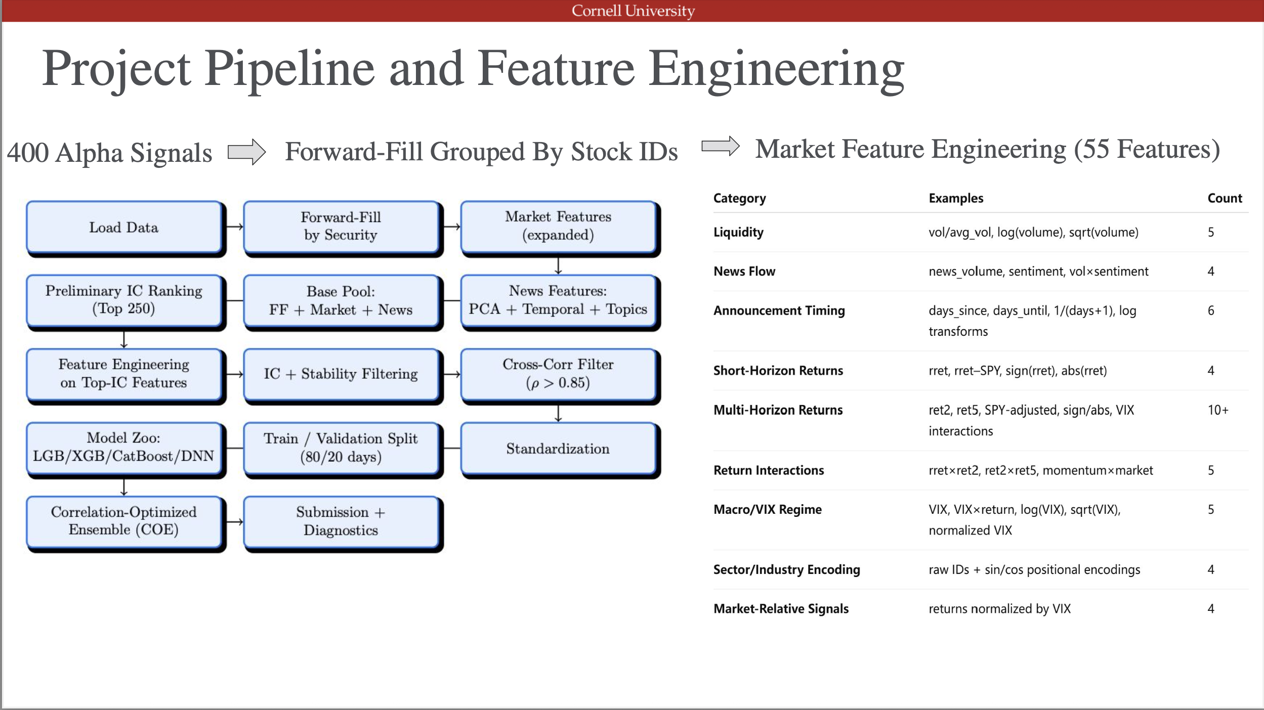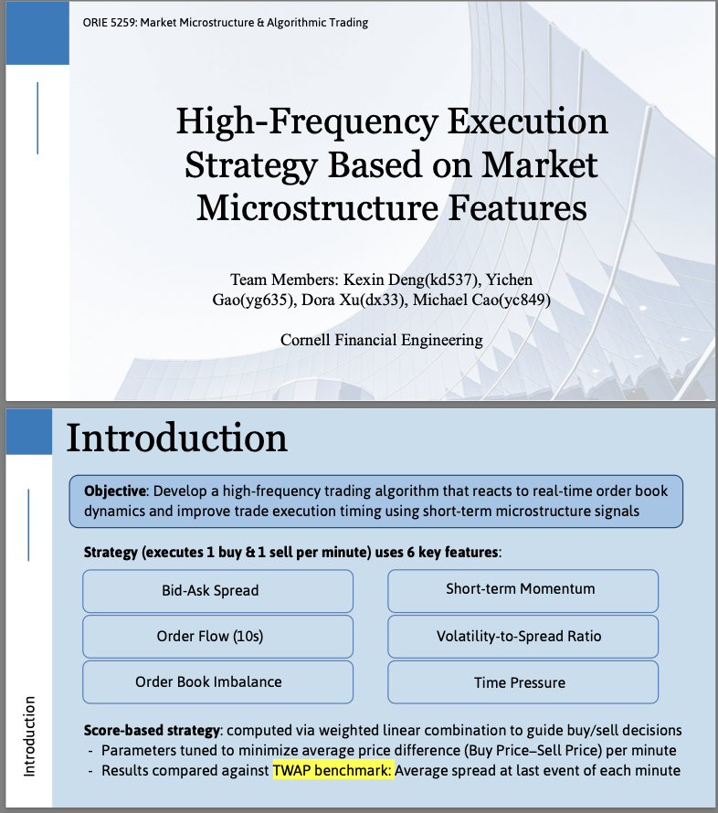 At Cornell, I conducted research on market microstructure, execution modeling, and regime-aware portfolio strategies. I have also built large-scale machine learning pipelines for cross-sectional equity prediction, including feature engineering, signal evaluation, and portfolio optimization.